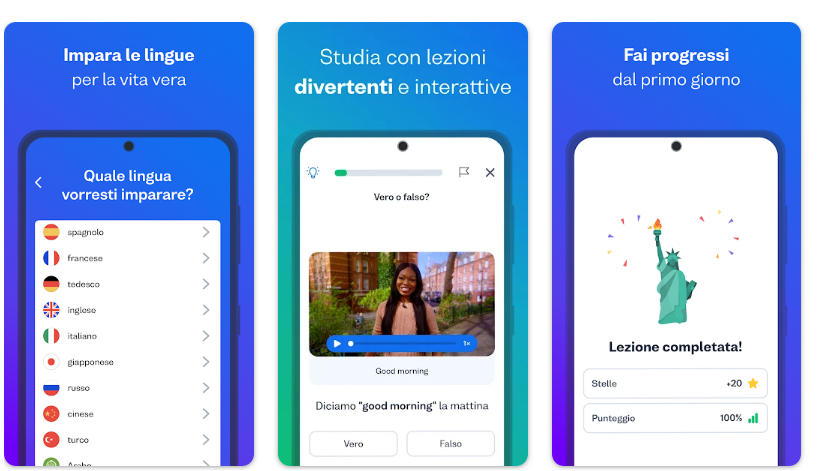 Duolingo è un applicazione diversa dalle precedenti, giocosa e ottima se parti da zero e vuoi costruire abitudine e vocabolario. Ogni lezione è breve e si gioca con punti e premi.
